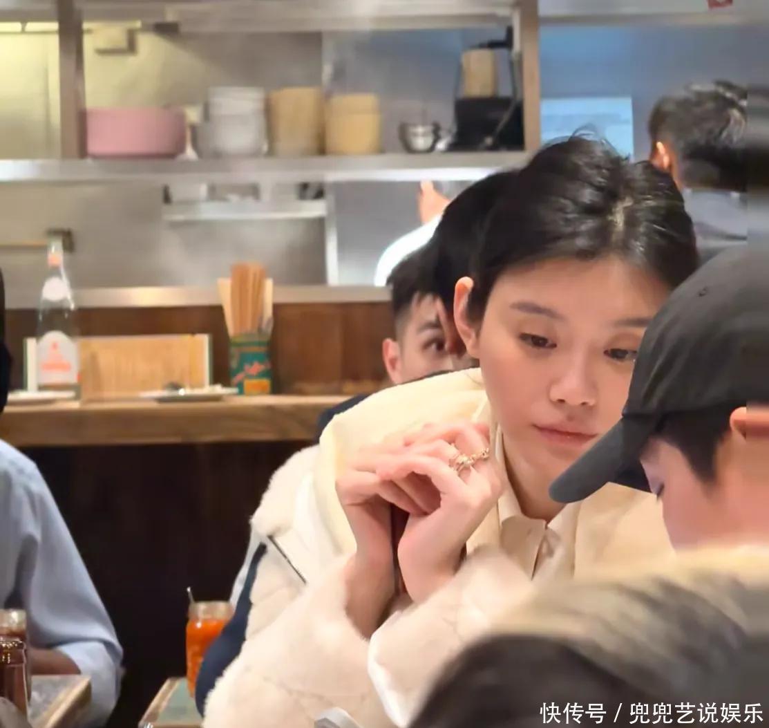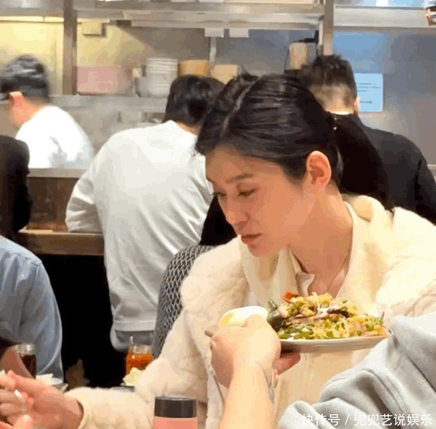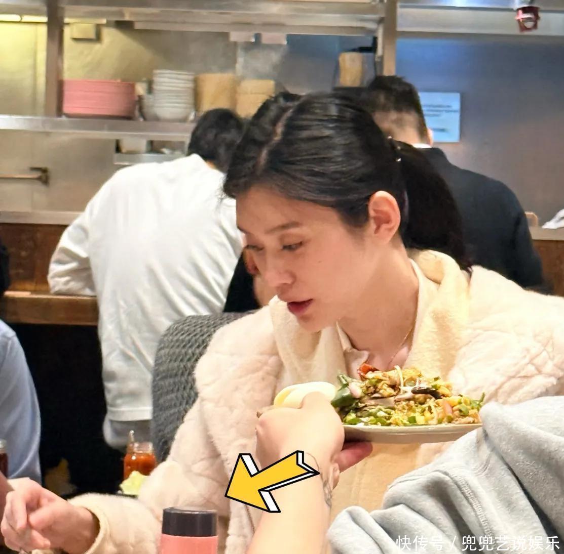她穿了一件白色皮草外套,里面叠穿了一件奶油黄色的毛呢短大衣。 这个黄色是今年流行的颜色。 她一开始披着头发,墨镜别在头顶。 等菜上桌,她很自然地把头发扎了起来,利落地开始吃饭。 网友注意到,她虽然身材很瘦,但面前那碗米饭配着菜,她吃得不少,一边吃一边和朋友聊天。她的手边放着一只粉色的史努比暖水杯,小巧可爱。 这只水杯和她当天佩戴的饰品形成了有趣对比:她只戴了一枚款式简约的素圈戒指和一条细锁骨链,耳朵上没有佩戴任何耳饰。 就在几天前,她庆祝37岁生日时,戴了一对来自意大利顶级珠宝品牌布契拉提的ROMBI钻石耳饰,价值16万元。